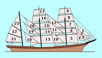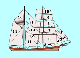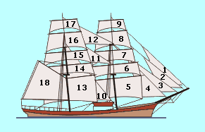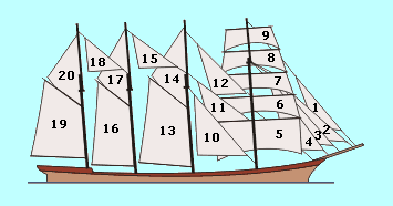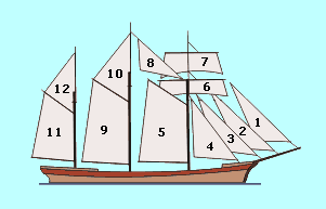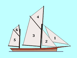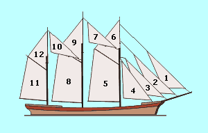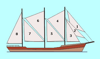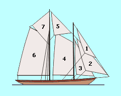 4 Vor-Stagsegel , 5 Schonersegel , 6 Vor-Gaffeltoppsegel