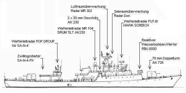1x FK-System SA-N-4 (8 Ä 10) Silo mit Hebebühne für Doppelstarter (ZIF 122) für RZ-13 Raketen; Max. Reichweite: 12 000 m;